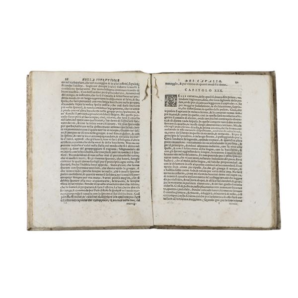 This is a treatise discussing the training, care, and preservation of horses, as well as methods for improving horse breeds. Rare edition, with decorative initials, headpieces, and end-of-section ornaments.