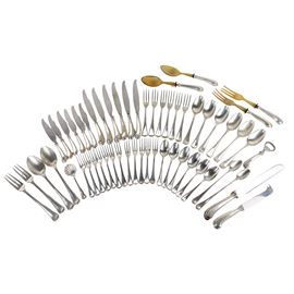 Servizio di posate in argento composto da 6 Cucchiai, 6 forchette, 6 coltelli , 6 cucchiaini, 12 forchette da frutta ,6 coltelli da frutta, 2 forchette da servizio, 2 cucchiai da servizio ,2 cucchiaini da servizio, coltello da pane,,forchetta e cucchiaio da insalata, coltello da formaggio,1 apribottiglie.