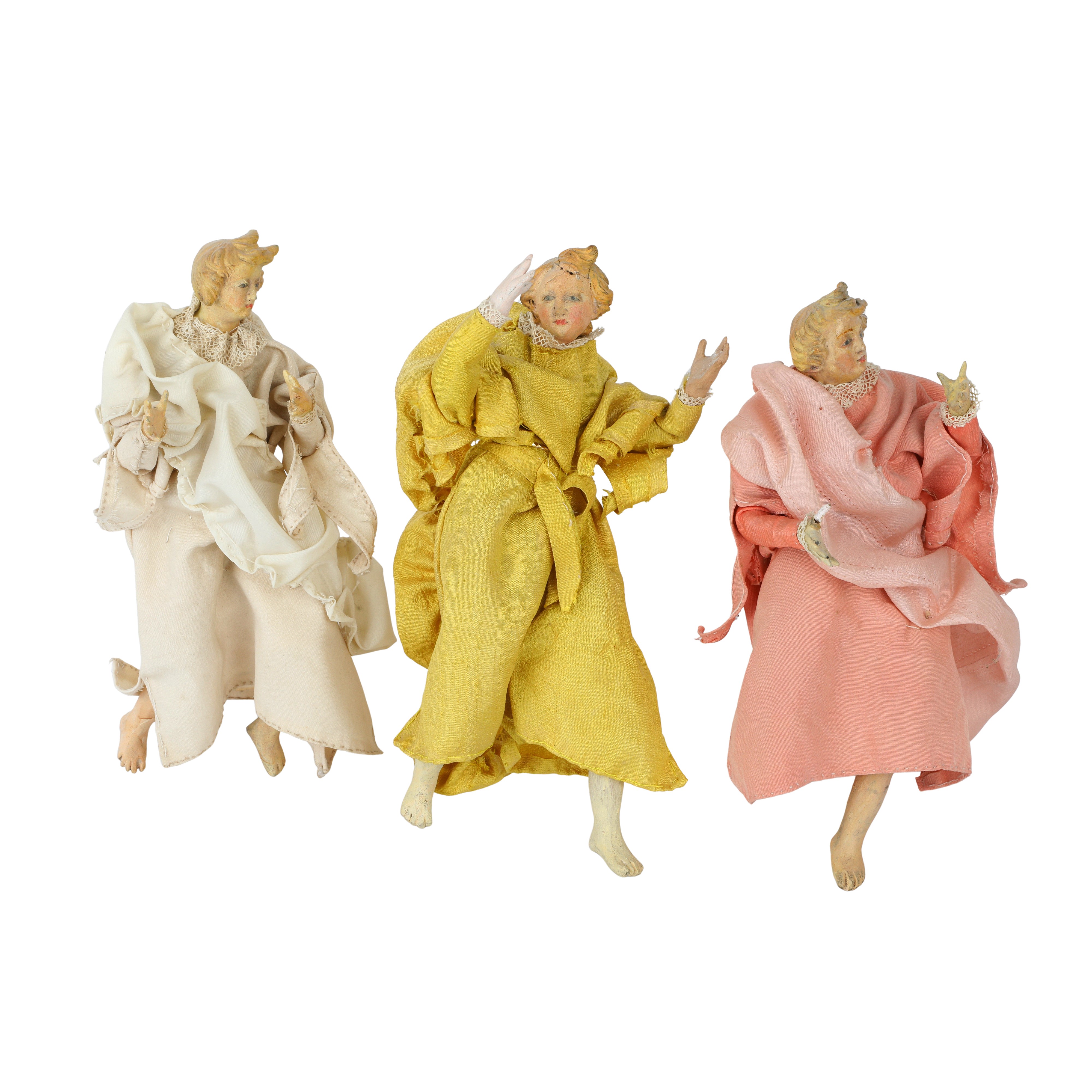 Testine in terracotta policroma, occhi in vetro, manichino in fil di ferro e stoppa, arti superiori e inferiori in terracotta policroma.
