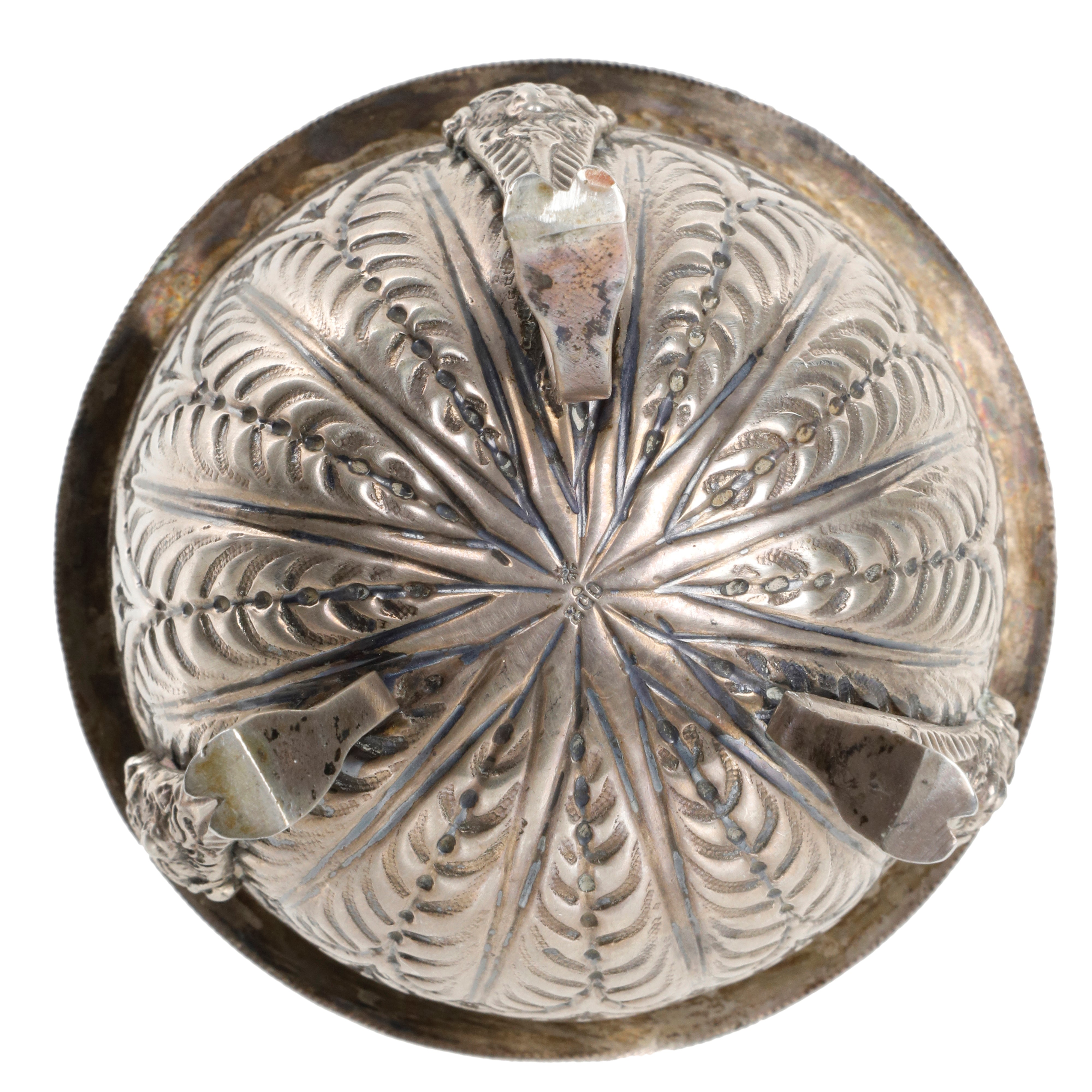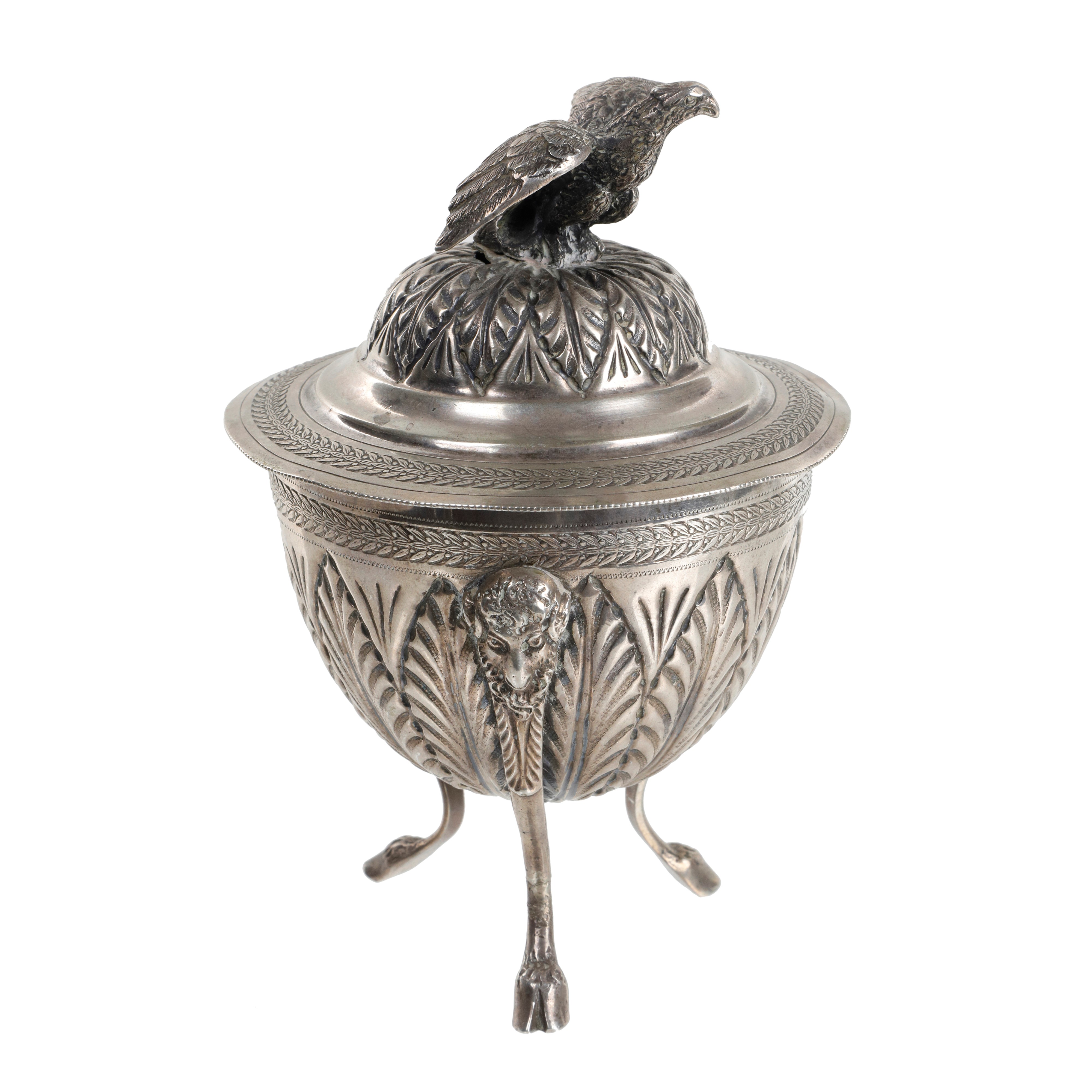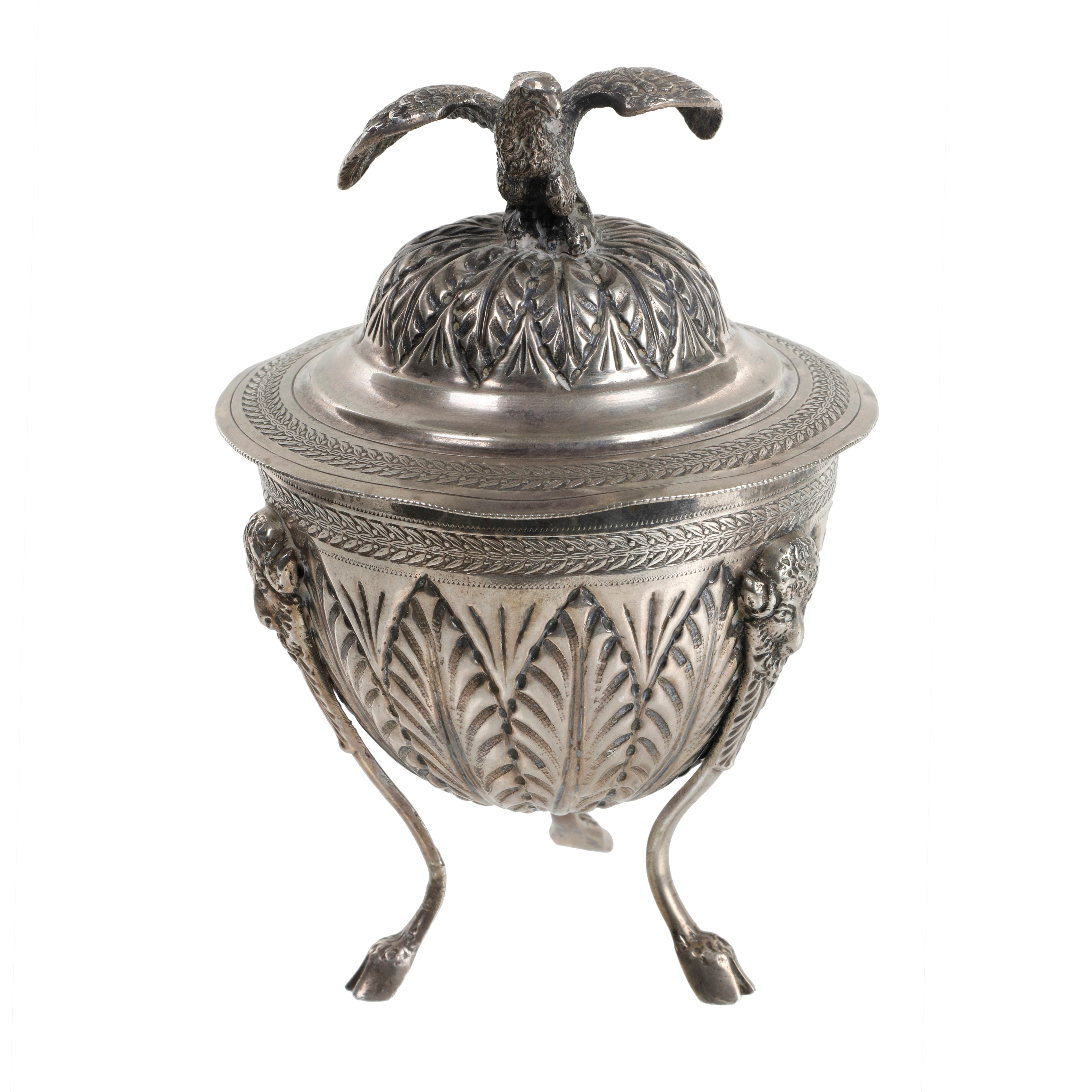 Decorazione a foglie d'acanto, tipiche dell'argenteria classica. Il bordo del coperchio è rifinito con una delicata ghirlanda di alloro. Il coperchio è sormontato da una figura raffigurante un'aquila con le ali spiegate, simbolo spesso associato al potere e alla nobiltà. La coppa poggia su tre gambe sottili che terminano con dei piedini a zoccolo caprino. Sulla parte superiore delle gambe si intravedono delle teste di ariete